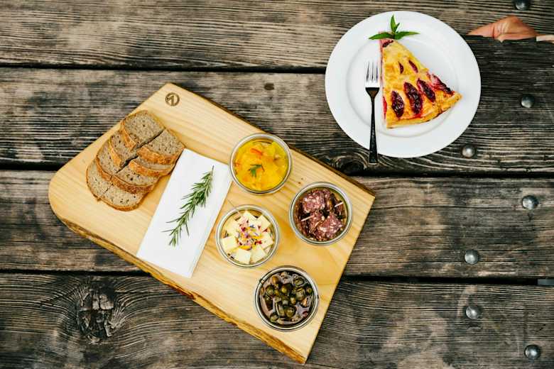 Die Chamanna Cluozza auf 1.882 Meter Seehöhe (oben) ist die einzige bewirtschaftete Hütte im Schweizerischen Nationalpark. Dort werden Nachhaltigkeit und Regionalität vor allem seit dem Umbau vor drei Jahren sehr ernst genommen: Das gilt für natürliche Baumaterialien wie Kalk und Stampflehm, die 30.000 Lärchenschindeln – und die Zutaten für die Speisen, etwa Alpentapas und Zwetschkenkuchen (unten). Foto: Martin Schachenhofer, Bergwelten Magazin