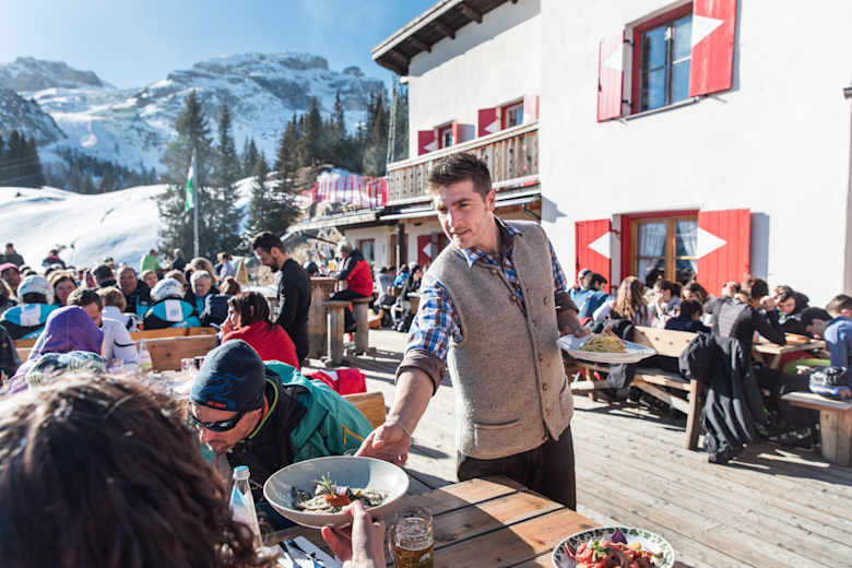 Die großzügige Terrasse zeichnet sich durch einen einmaligen Ausblick auf die Marmolada aus. Sie ist vor Wind geschützt und genießt Sonne bis in die späten Nachmittagsstunden. Kinder sind herzlich willkommen und können auf dem kleinen Spielplatz toben, während die Eltern unbekümmert die Ruhe auf 2.000 m genießen.