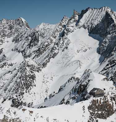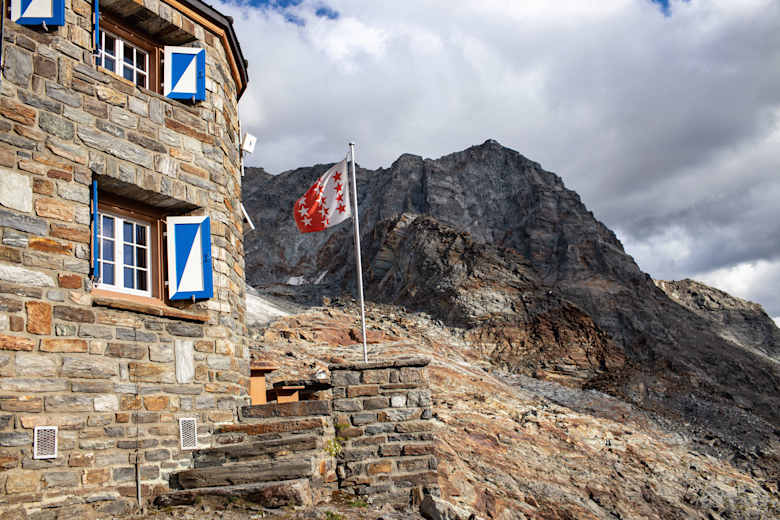 Die 2012 erweiterte Domhütte liegt in den Walliser Alpen am Ausläufer des Festigletschers.Foto: Nico Schärer, Bergwelten Magazin Schweiz 04-2020