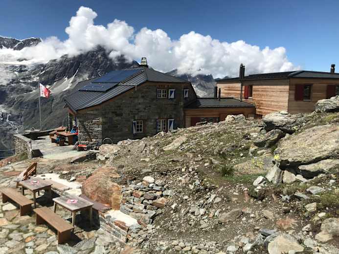 Wunderschöne Aussicht auf die anspruchsvollen Viertausender Weißhorn, Zinalrothron und Obergabelhorn, gutes Essen und eine sehr gemütliche moderne Hütte sind die Zutaten, die einen Aufenthalt auf der Domhütte ausmachen. Dabei ist die Hütte sehr stark auf Hochtourengeher fokussiert. Auch deshalb, weil sie von einem Bergführer bewartet wird – so bekommt man immer beste Informationen zu den Tourenverhältnissen aus erster Hand.