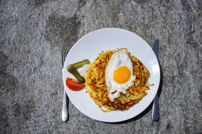 Kartoffelrösti mit Ei auf der Domhütte.Foto: Nico Schärer, Bergwelten Magazin Schweiz 04-2020