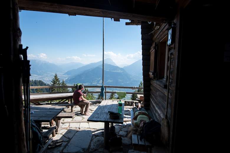 Geringe Höhe, ideale Lage: Auf der Terrasse der Enderlinhütte bleiben die Gäste gern länger sitzen.Foto: Samuel Trümpy, Bergwelten Schweiz 03/2019