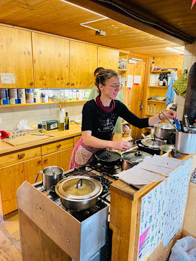 Das Bier wird im Trog vor dem Haus im fließenden Wasser gekühlt, der Schnittlauch für die Suppe wächst wild auf den Wiesen. Es geht auf dieser Hütte also äußerst unkonventionell und darüber hinaus sehr familiär zu. Das Küchenteam verwendet zum größten Teil biologische, regionale und frische Produkte. Und kocht auch für Vegetarier.