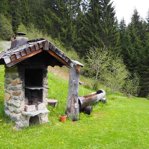 Wenn man nun noch gute Laune mitbringt, kann man es sich richtig gemütlich machen. Vor der Hütte befindet sich ein kleiner Brunnen, der Ausblick ins Tal ist prachtvoll.