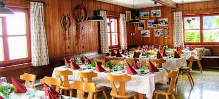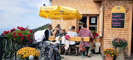 Beste Hausmannskost aus der eigenen Landwirtschaft garantieren die Hüttenwirte Elisabeth und Florian Burtscher. Auch die Schnäpse, der Most und der Apfelsaft kommen aus eigener Produktion, das Bier kommt vom Fass. Als Spezialität gelten die Kässpätzle und der Schweinsbraten.