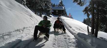 Auch im Winter ist die Hütte erreichbar und bietet Rodlern auf dem gewalzten Weg eine perfekte Abfahrt.