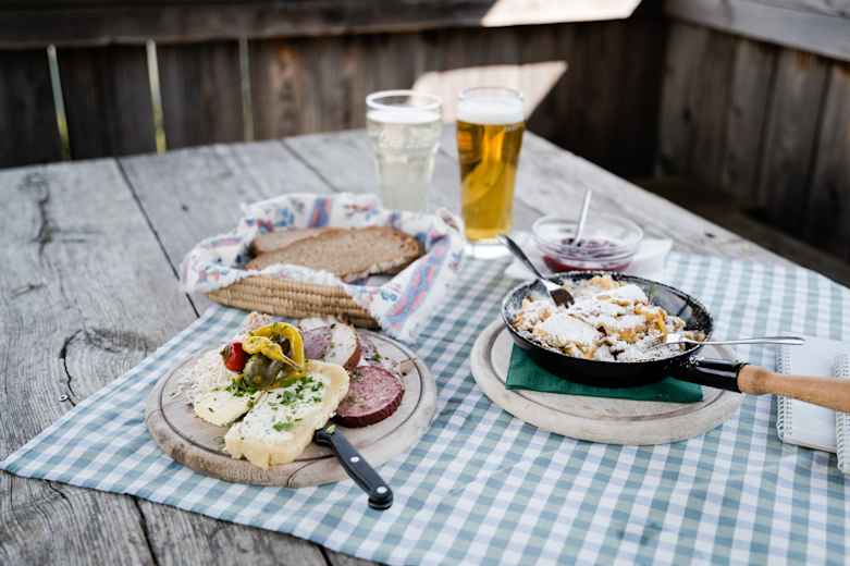 Das Hüttenteam legt Wert darauf, frische regionale Produkte zu verarbeiten. Daraus zaubert es zum Beispiel köstlichen Braten, flaumigen Kaiserschmarrn oder cremige Kasnocken.
