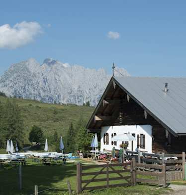 Die nächstgelegene Hütte ist das Anton-Karg-Haus (829 m, 0:15 h). Weiters: Stripsenjochhaus (1.755 m, 1:30 h), Kaindlhütte (1.318 m, 2:30 h), Vorderkaiserfeldenhütte (1.388 m, 2:30 h), Gruttenhütte (1.620 m, 5 h)