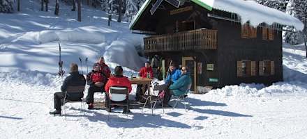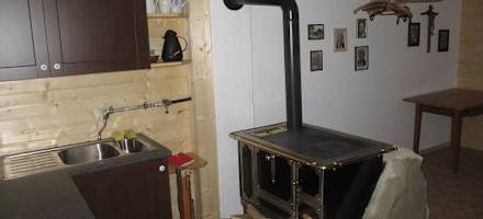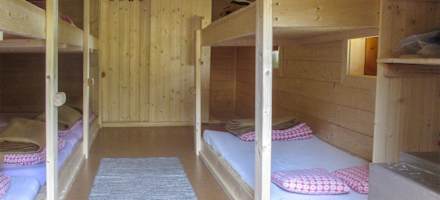 Das Herzstück der einfachen Hütte ist der große Holzofen zum Heizen und Kochen im kleinen Aufenthaltsraum, der knapp 20 Personen Platz bietet. Die Schlaflager befinden sich im Obergeschoss. Vor der Hütte – Sitzmöglichkeiten sind vorhanden – gibt’s eine große Lagerfeuerstelle.