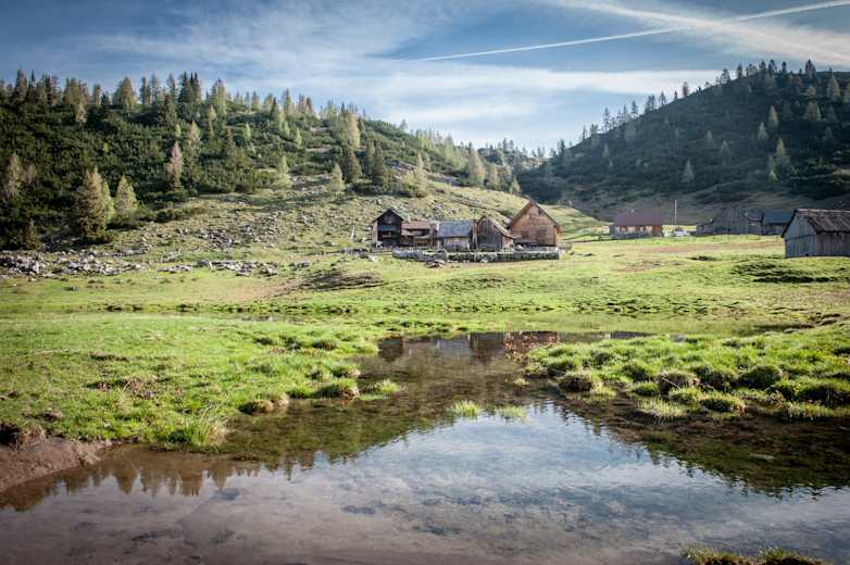 Im Frühjahr, bei Schmelzwasser, spiegelt sich die Hütte im sonst verschwundenen kleinen SeeFoto: Rene Sendlhofer-Schag