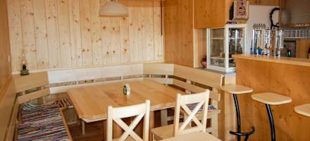 Wenn die Hütte an Wochenenden voll bewirtschaftet ist, gibt’s meist zwei oder drei warme Gerichte, die frisch zubereitet werden. Im Inneren haben rund 40 Gäste Platz, auf der Terrasse 80 bis 100. Da wie dort wird bedient. Kindern steht ein kleiner Spielplatz zur Verfügung.