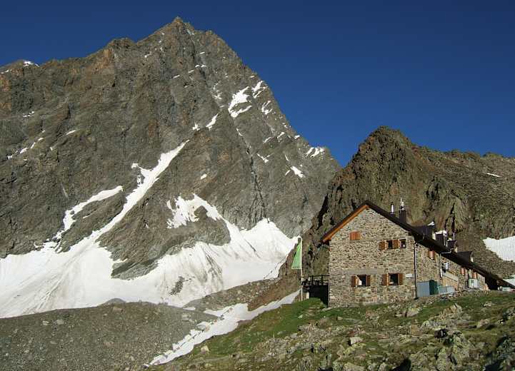 Die Kaunergrathütte vor der mächtigen WatzespitzeFoto: Tourismusverband Pitztal; Tirol Werbung