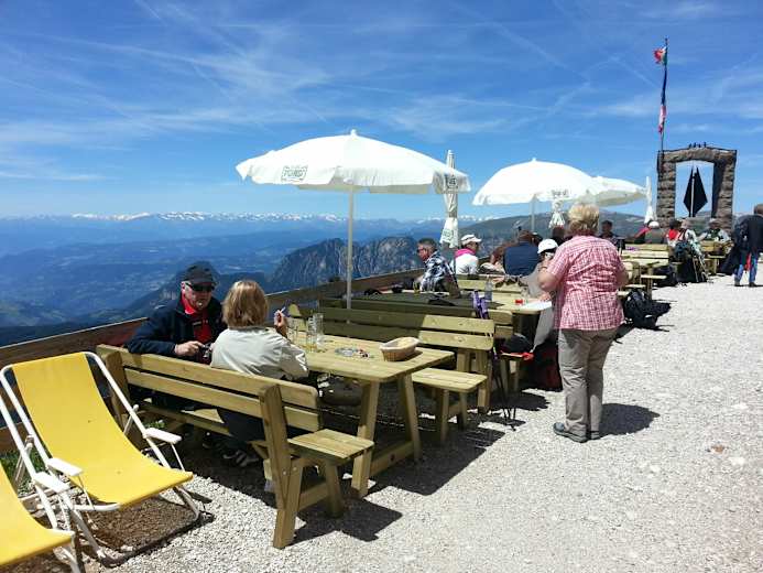 Von der Frommeralm kann man ganz einfach mit der Seilbahn König Laurin zur Hütte gelangen. Oder man wandert zu Fuß über den Weg Nr. 1 zur Hütte.