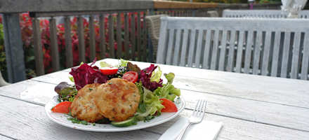 Es werden Getränke und Frühstück serviert. Besonders schöner Ausblick von der Terrasse. Er herrscht Bedienung.