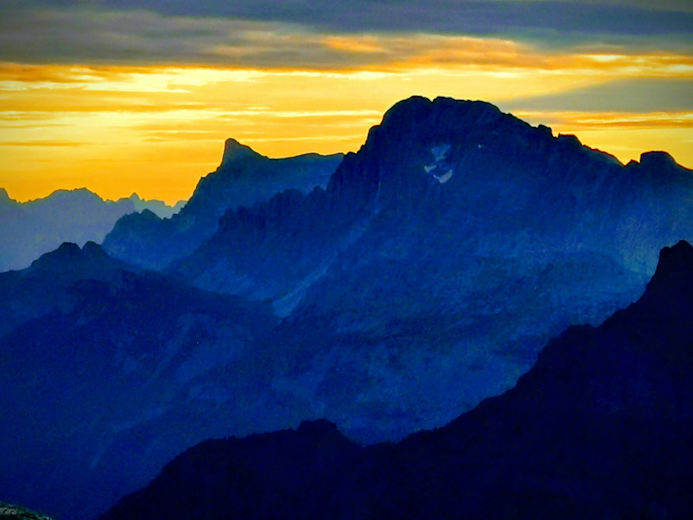 Vom Passo di Vallés, 2.031 m, 3 bis 3.30 Stunden über den Weg 751 (Alta Via Dolomiti 2) über die Venegia-Scharte, Passo Venegiotta, Passo dei Fochét, unterhalb der Ostwand des Mulaz (teilweise drahtseilversichert)