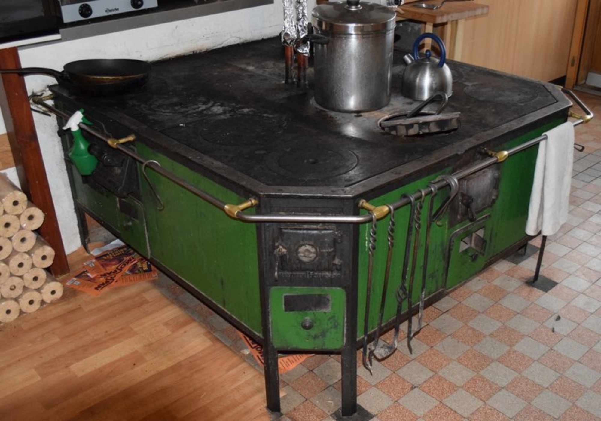 Das Prunkstück des Hauses ist der übergroße Holzherd. Er wurde vor rund sechzig Jahren extra für das Naturfreundehaus gebaut und verfügt über fünf Löcher zum Einfeuern. So konnten gleichzeitig fünf Parteien auf diesem Herd ihr Süppchen kochen. Heute brutzeln in den Bratpfannen auf dem großen Kochfeld vor allem feine Rösti, Käseschnitten oder ein gutes Stück Fleisch.