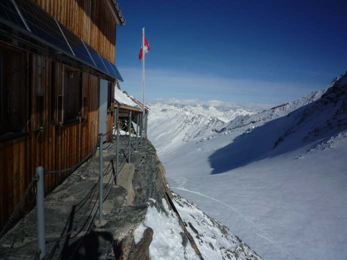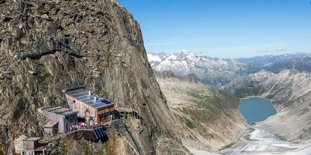 Die Oberaarjochhütte (3.258 m) des SAC in der Finsteraarhorngruppe im Berner Oberland darf sich rühmen, eine der Hütten mit bester Aussicht zu sein. Vielleicht sogar jene mit der Allerbesten! Von der Berninagruppe im Osten über alle namhaften Walliser Gipfel wie Dufourspitze, Dom, Matterhorn, Weisshorn bis zum nahen Finsteraarhorn reicht das Gipfelpanorama.