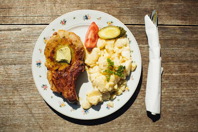 Die Spezialität der Ochsenhütte auf der Alp Selun: Kotelett mit Kartoffelsalat. Foto: Elias Holzknecht, Bergwelten Magazin Schweiz, 02/2019 Bildergalerie (3) Karte ansehen