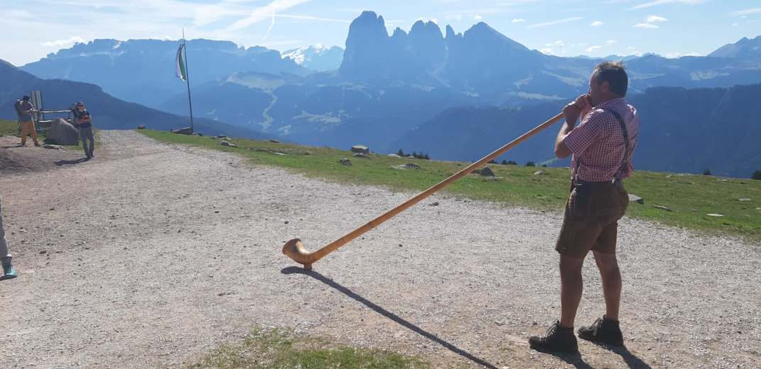 Alphornbläser auf der Terrasse der Raschötzhütte Foto: David Piazza