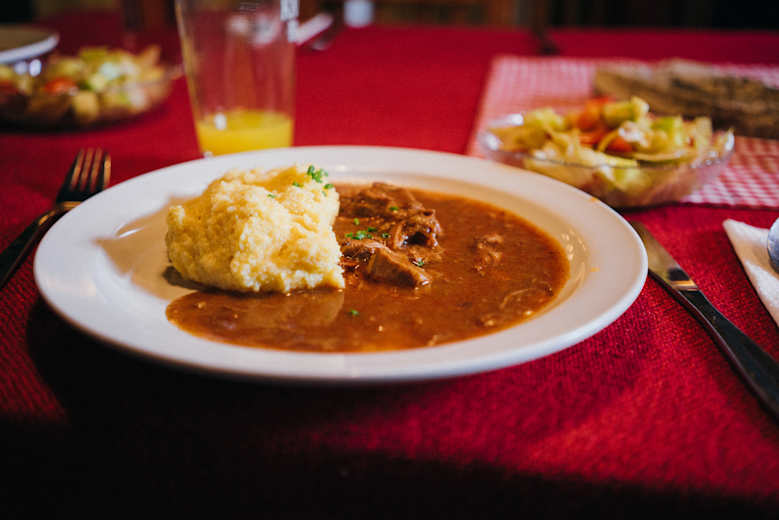 Zartes Gulasch mit Polenta gehört zur Stammkarte. Das Fleisch ist von einem Krimmler Fleischhauer, Kräuter werden neben der Hütte selbst gezogen. Foto: Sam Strauss, Bergwelten 03/2018 Bildergalerie (6) Karte ansehen