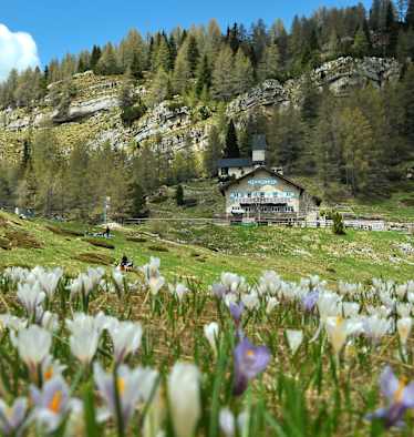 Das Rifugio Stivo Prospero Marchetti erreicht man nach etwa zwei Stunden vom Parkplatz. Die Wanderung beginnt bei S. Antonio, anfangs über eine asphaltierte Strasse; bald erreicht man den Weg 608B der durch den Wald steigt, bis zu den „Prese“, mit einem Holzkapitell und einer Sitzbank.