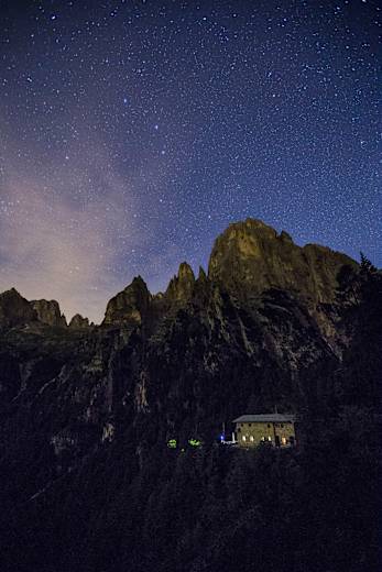 Die Terrasse der Hütte (1.631 m) blickt auf die dicht bewaldete obere Val Canali. Wenn man den Blick hebt, sieht man die südlichen Wände der Pale di San Martino: der Pala del Rifugio und weiter oben Sass d’Ortiga und Croda Granda. Die Hütte ist von Anfang Juni bis Mitte Oktober geöffnet.