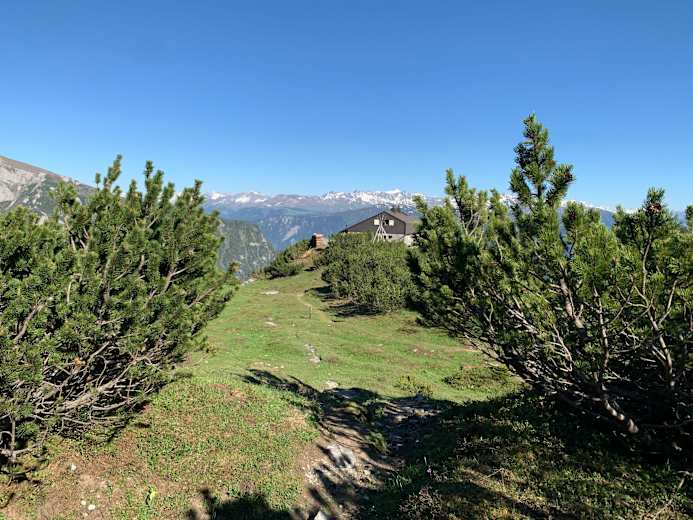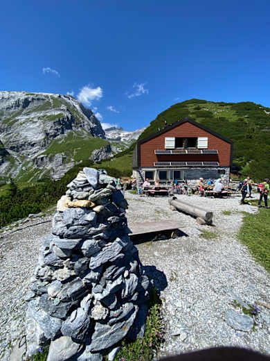 Das erste, das einem beim Besuch der Hütte auffällt, ist die sehr sonnige Lage: auf einem kleinen Vorhügel steht die Hütte über dem Rheital auf der einen Seite, über dem Taminatal auf der anderen. Die Spitzen der Calanda, die wild und kaum erreichbar erscheinen, strahlen vom Osten herüber.