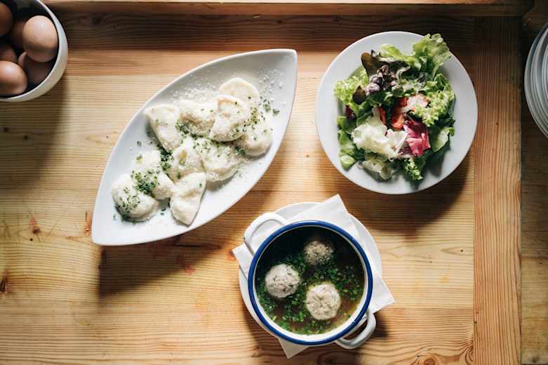 Schlupfkrapfen, Knödel und Salat auf der Roaner Alm Foto: Jan Richard Heinicke