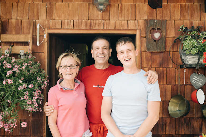 Wirtin Lydia Pichler, Koch Robert Quitt und Servicekraft Chiel van Dyk vor der Roaneralm Foto: Jan Richard Heinicke