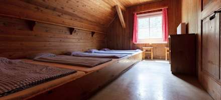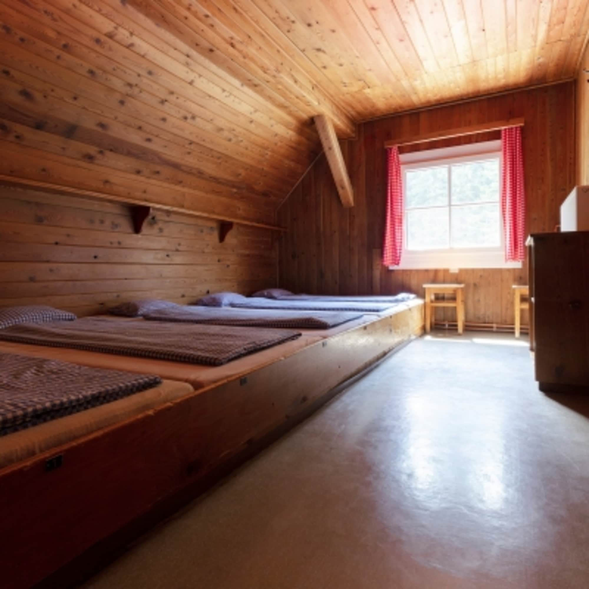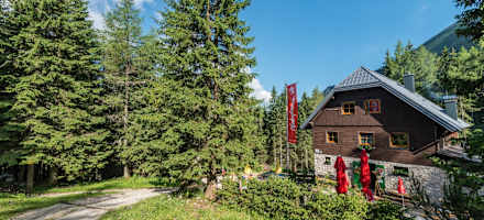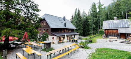 Auf der Speisekarte stehen typische Hüttengerichte wie Schweinsbraten, Gulasch, verschiedene Knödel und Mehlspeisen. Zum Übernachten stehen neu renovierte Zimmer mit Betten und Matratzenlager zur Verfügung.