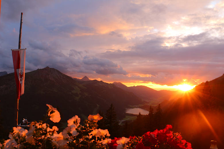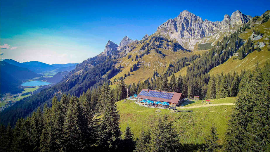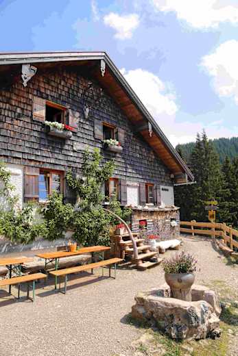 Alternative: Von Höfen mit der Seilbahn zum Panoramarestaurant Hahnenkamm und von dort auf Weg 418 über das Tiefjoch zur Alm (45 min).