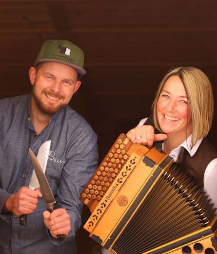 Gäste genießen in der gemütlichen Stube oder auf der großzügigen, aussichtsreichen Sonnenterrasse regionale Spezialitäten und können auch übernachten. Das ist besonders zu empfehlen, wenn auf der Alm gefeiert wird. Regelmäßig finden Almfeste und Frühschoppen mit Musikbegleitung statt, noch häufiger wird spontan musiziert. Auf der Alm stehen jede Menge Instrumente zur Verfügung: Gitarren, Bassgeige, Trompete, Flügelhorn, Klarinette, Akkordeon, Steirischen Harmonikas und sogar ein Alphorn – nicht nur das Alm-Team musiziert gerne, auch manch musikalischer Besucher schließt sich gern an.