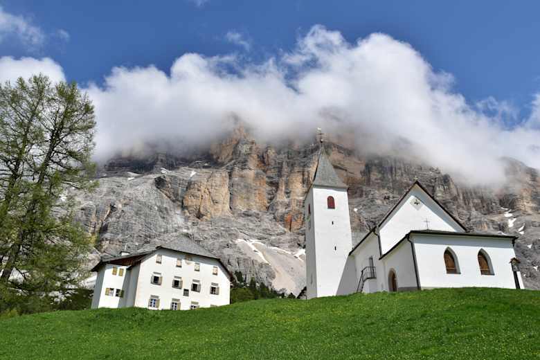 Das prächtige Szenario der Dolomitenlandschaft und die herrliche Aussicht auf die umliegende Bergwelt verleiht dem historischen Hospiz seinen außergewöhnlichen Charakter.