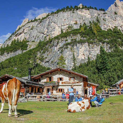 Die Scotonihütte (2.040 m) befindet sich auf einer kleinen Alm im Gardertal am südlichen Rand des Naturparks Fanes-Sennes-Prags. Im Talschluss von St. Kassian und unterhalb der mächtigen Südwände der Cunturines gelegen, lockt dieser zauberhafte Stützpunkt im Sommer Wanderer und Radfahrer, Kletterer und Bergsteiger, im Winter Schneeschuhwanderer und Skitourengeher.