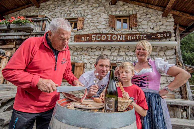 Die Scotonihütte in den Dolomiten ist der kulinarische Hotspot unter den Südtiroler Hütten schlechthin. Selbst im Hütteninneren wird über offenem Feuer gegrillt, wobei so mancher Gast alleine wegen der T-Bone-Steaks, den hausgemachten Schlutzkrapfen oder dem ausgezeichneten Kaiserschmarrn hierher kommt.