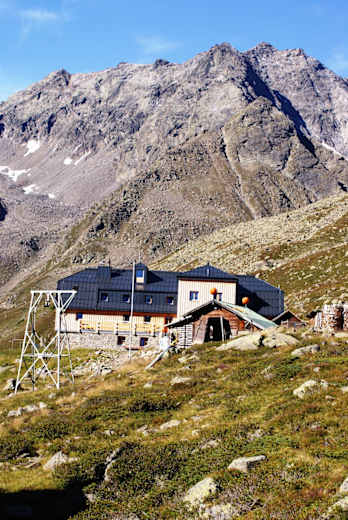 Die nächstgelegene Hütte ist die Winnebachseehütte (2.372 m, 3:30 h). Weitere Nachbar-Hütten: Pforzheimer Hütte (2.308 m, 4:30 h); Amberger Hütte (2.135 m; 5:30 h) und Franz-Senn-Hütte (2.147 m, 6 h).