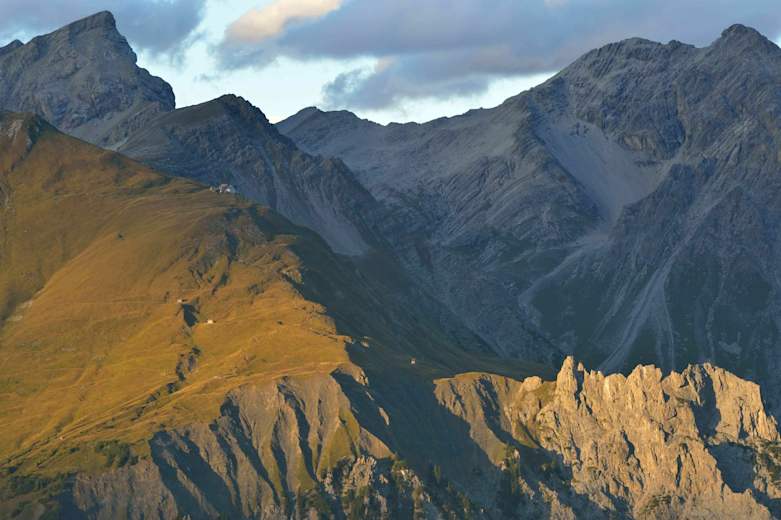 Die nächstgelegene Hütte ist die Frederic-Simms-Hütte in 2.004 m, die in 4 h Gehzeit zu erreichen ist. Weiters: Kaiserjochhaus (2.310 m, 4:15 h); Augsburger Hütte (2.298 m, 8 h); Memminger Hütte (2.242 m, 5:15 h).