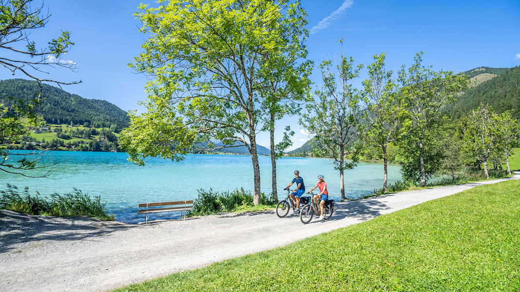 Auch mit dem Bike lässt sich die Umgebung des Weissensees bestens erkunden. Dafür stehen 13 ausgeschilderte MTB-Stecken mit 160 Kilometern Länge, drei flotte Trails und ein Natur-Pump-Track zur Verfügung. Sommer-Bergbahn und Weissensee-Schifffahrt transportieren natürlich auch Bikes und der Weissensee als reinster Badesee der Alpen lädt bei praktisch jeder Tour zwischendurch oder im Anschluss zur Abkühlung ein.