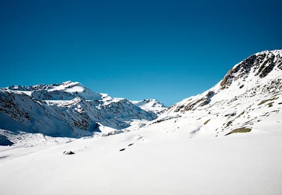 In nur wenigen Sekunden ist der Reschen-Rummel auch wieder vergessen. Die Szenerie ist wuchtig und heimelig zugleich. Die Weißseespitze mit ihren 3.532 Metern steht zur Linken, die 3.738 Meter hohe Weißkugel zur Rechten. Ganz hinten, weit oben, liegt das Gletschereis und das Kaunertaler Skigebiet. Unten am Ende des Tals liegt Kappl: eine Kirche, eine Langlaufloipe, einige Skitourenspuren, die unter anderem Richtung Maseben-Hütte führen.