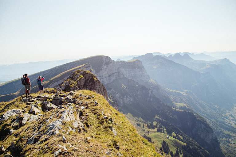 Vom Zuestoll geht es zunächst wieder auf 1.736 m hinab zum Rüggli – hier besteht keine Möglichkeit abzukürzen oder Höhenmeter einzusparen. Also heißt es im Anschluss wieder auf den Gipfel des Schibenstoll und auf knapp 2.300 m aufsteigen. Dieser Anstieg zählt für uns zu den härtesten Metern nach oben – haben wir doch bereits rund 3.000 Höhenmeter in den Beinen. Beim Gipfelkreuz angekommen sind wir etwas verwundert kaum andere Wanderer anzutreffen, doch so haben wir die Aussicht fast für uns alleine.