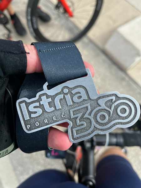 Das Ortsschild von Porec wirkt fast zu mickrig für den großen Moment. Doch spätestens beim Einbiegen in die von Reklameplanen gesäumte Zielgerade kommt die feierliche Stimmung auf, die er sich verdient. Ich verzichte gnädiger Weise darauf, Robert niederzusprinten und willige seinem Vorschag ein, uns beim Rollen über die Ziellinie die Hände zu reichen. Ohne ihn hätte ich sie heute vielleicht gar nicht gesehen. Nach etwas mehr als 7 Stunden. Kurz dahinter bekommen wir schon die Istria300-Medaille in die Hand gedrückt. Die Emotionen können mit der Geschwindigkeit des Protokolls nicht mithalten.