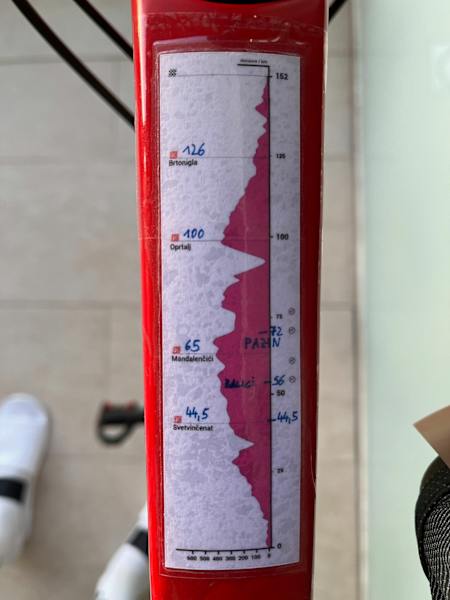 Beim Aufziehen der Balkongardine ist schon alles vorbereitet: Wir haben gestern Abend die Startnummern mit Sicherheitsnadeln ans Trikot geheftet (ich habe mich fürs neue Istria300-Outfit entschieden), die Bikes an Lenker und Sattel mit dem Starter-Namen versehen, die Isotone in die Trinkflaschen gefüllt und im „Roadbook“ nochmal grob die Strecke studiert. Unsere Strategie? „Einfach immer links halten!“, erinnert mich Robert ans Wesentliche. So verirrt man sich nicht unabsichtlich auf die beiden längeren Routen. Mittlerweile sind wir uns einig, dass wir uns bei unserem ersten Antritt mit der 155-km-Route begnügen. Er hat sich das Strecken-Profil klugerweise zuhause ausgedruckt und aufs Oberrohr geklebt. Ich habe darauf vergessen – stattdessen fotografiere ich sein Oberrohr ab und stelle das Bild einfach als Screensaver auf meinem Handy ein. Teamwork ist wichtig.