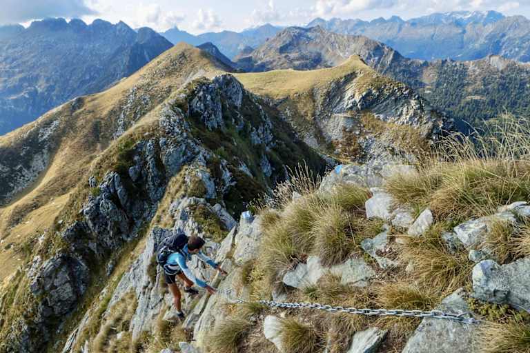 Die Via Alta Vallemaggia führt auf wahlweise 16 oder 17 Etappen über ausgesetzte Felsgrate und Geröllfelder, vorbei an Bergseen und Blumenwiesen.