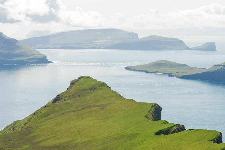 In einem weit geschwungenen Halbkreis queren wir das unfassbar grüne, einsame Djupidalur-Tal. Wir hören nur Vögel kreischen und hier und da ein Schaf blöken: Es sind wohl die gleichen Geräusche, die die Wikinger einst hörten, als sie ihren Fuß zum ersten Mal auf die Färöer setzten. Schließlich erreichen wir eine versteckte Höhle einige hundert Meter fast senkrecht über dem Meer und blicken auf die Nachbarinsel Eysturoy. An ihrer Nordspitze ragen zwei markante, 70 Meter hohe Basaltfelsen aus dem Meer: Risin und Kellingin sind vom Sonnenlicht versteinerte Trolle, so erzählt man sich, die die Färöer gen Island ziehen wollten – nur eine der unzähligen Sagen, die sich um die bizarren Launen der färöischen Landschaft ranken.