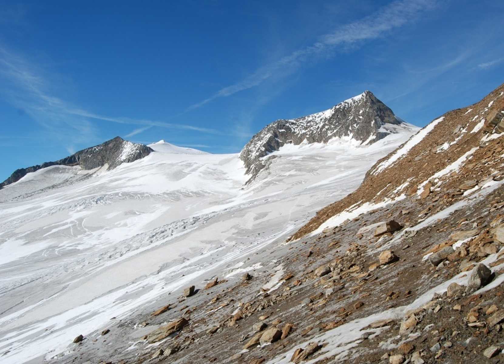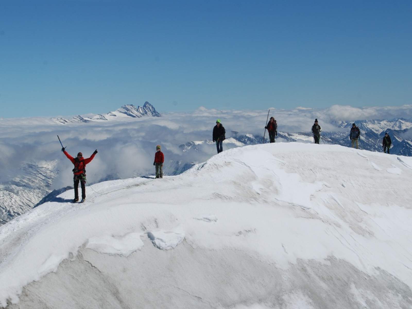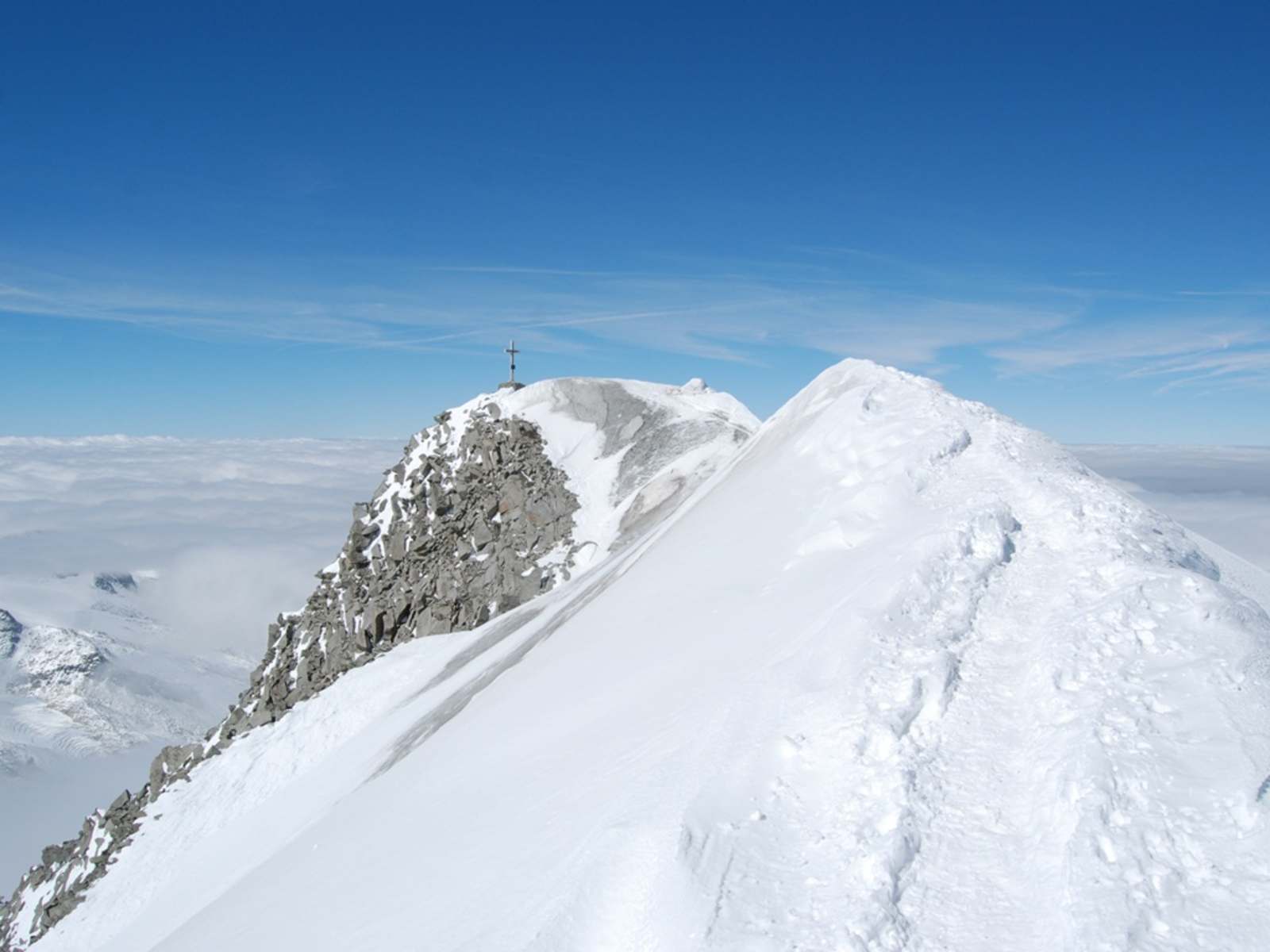 Nach der letzten Steigung erreicht man den schmalen Firngrat zum Gipfel. Der kostet noch ein wenig Überwindung, doch dann tritt man dem Gipfelkreuz, und der weltalten Majestät gegenüber. Ein traumhafter Rundblick eröffnet sich über den Nationalpark Hohe Tauern und seine umgebende Bergwelt mit dem Großglockner, den Dolomiten, dem Dachsteingebirge und vielen anderen.