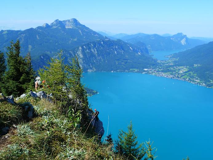 Weniger steil geht es nun in weiteren rund 20 Minuten zur Abzweigung Brennerin, die man von hier in rund 30 min erreicht. Die Aussicht auf den tief unten liegende, türkisfarbenen Attersee ist atemberaubend. Wieder retour auf dem Weg, geht es weiter bis zu einer Weggabelung. Die wenigen Meter zum Hochleckenhaus könnte man durchaus für eine gemütliche Einkehr in Kauf nehmen.