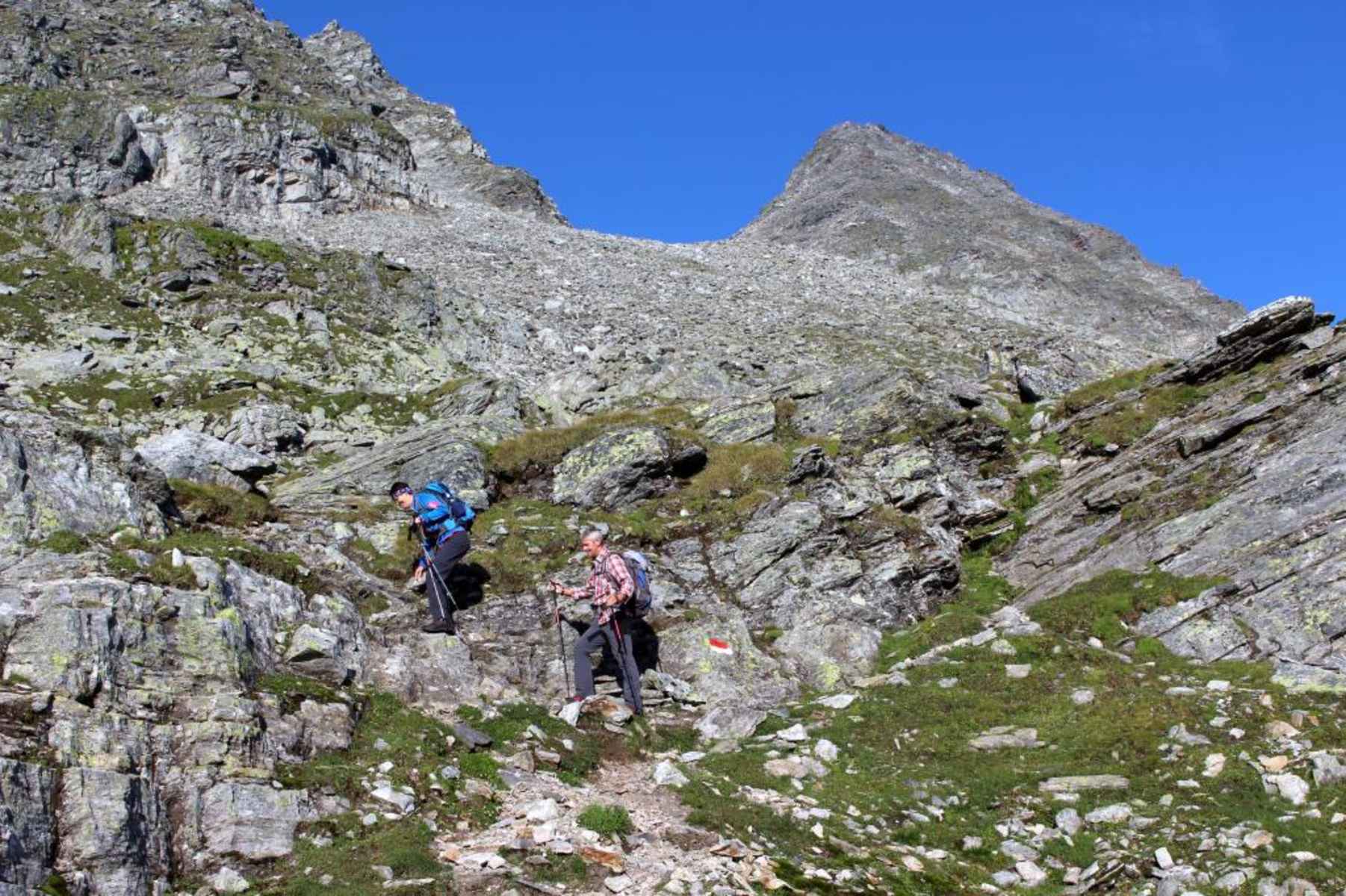 Gleich neben der Terrasse der gastlichen St. Pöltner Hütte gibt ein Wegweiser die Richtung nach oben mit der Wegnummer 523 vor. Der markierte Steig führt an ein kleines Kar mit den Ausläufern eines steilen Schneefelds heran (ca. 2.640 m), das meist auf einer Trasse schräg gequert wird. Besondere Vorsicht bei Vereisung, Bedingungen eventuell bei der St. Pöltner Hütte erfragen!