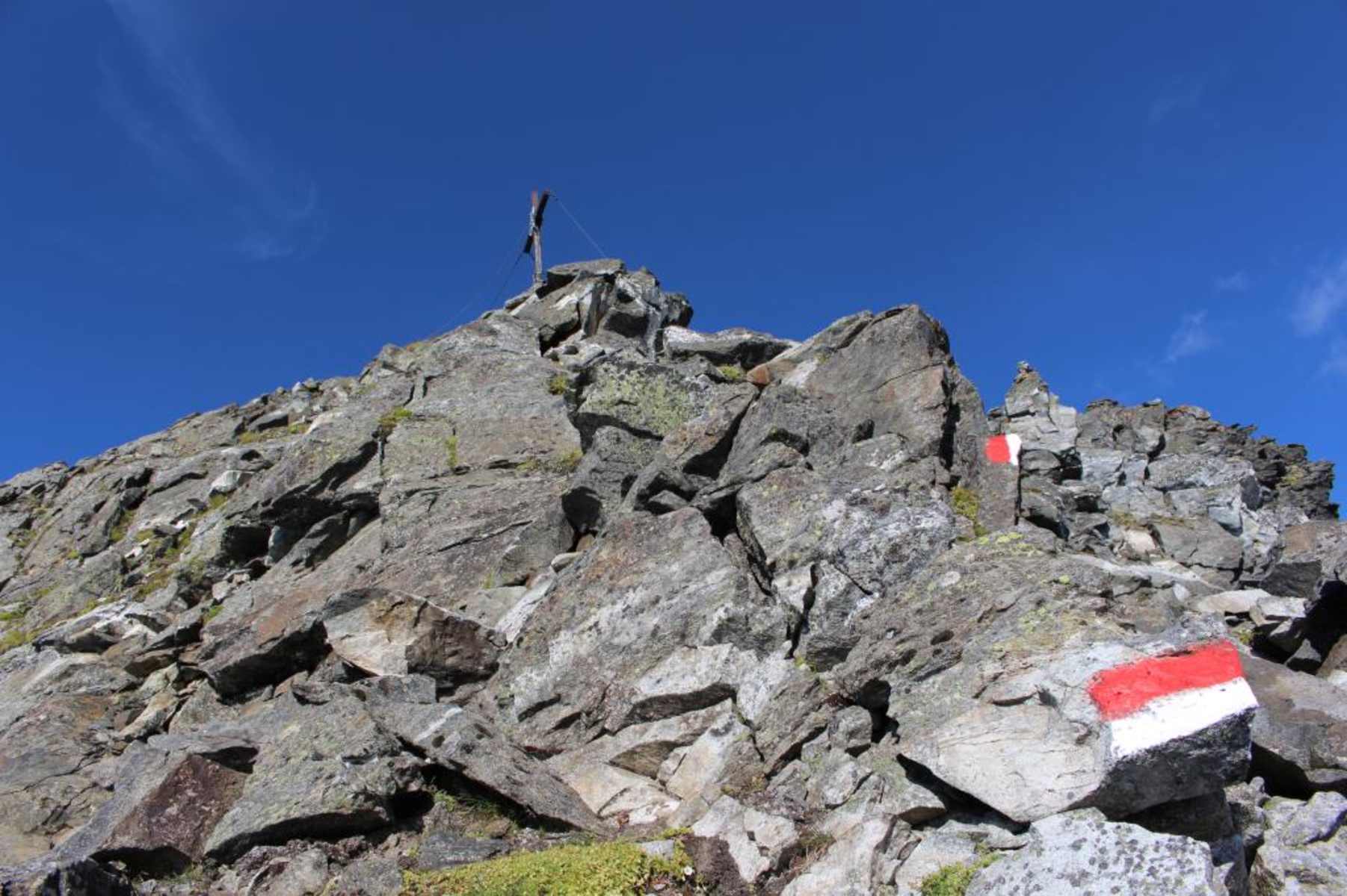 Danach erreicht man eine kleine Einsattelung des Ostgrats, dem man weiter über sehr blockiges und steiles Gelände bis direkt beim Ausstieg am schon lange sichtbaren Gipfelkreuz folgt. Neue Farbmarken erleichtern die Orientierung.