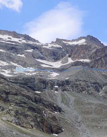 Man folgt dem Deloretteweg auf über 3.000 m und findet sich nun auf dem spaltenreichen Gletscher, wo man sich an sichtbaren Stangen orientiert. Nach der Passage im Eis Richtung Westen bzw. Nordwesten folgt bereits der letzte Abschnitt der Tour. Über Blockwerk steigt man empor und gelangt so zum Brandenburger Haus.