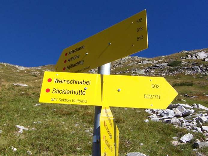 Man startet beim Parkplatz Kölnbreinsperre und wandert auf dem Seeweg entlang des Kölnbreinspeichers bis zur Gedenkstätte. Dann nimmt man den Weg zur Jägersteighütte bis zur Weggabelung Arlhöhe oder Weinschnabel und geht nach rechts in Richtung Gipfel des Weinschnabel.
